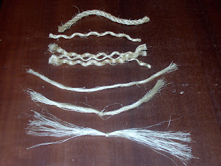 Firstly, the rope needs to be unwound (as if I need to tell you that) into it`s separate strands (1 and 2 from the top in my photo) but as you can see, it looks like hanks of hair from a spiroperm. To straighten it out, and this is the clever bit, chuck all your strands into the kitchen sink and pour boiling water over them, and watch them uncurl (3 from the top).